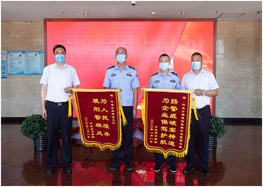8月10日上午,集团公司培训中心主任孔德明、工会主席郑春梅、租赁公司副总经理刘秀举、综合管理部助理孟醒代表沈阳李军医学研究有限公司来到北京市公安局怀柔分局,为怀柔分局雁栖经济开发区派出所和怀柔分局刑侦支队赠送锦旗,锦旗上分别绣有“扬警威破案神速,为企业保驾护航”、“为人民服务,展刑警雄风”的大字,对此次成功破获我集团租赁公司失窃案的全体民警、刑侦警官表示由衷的感谢!